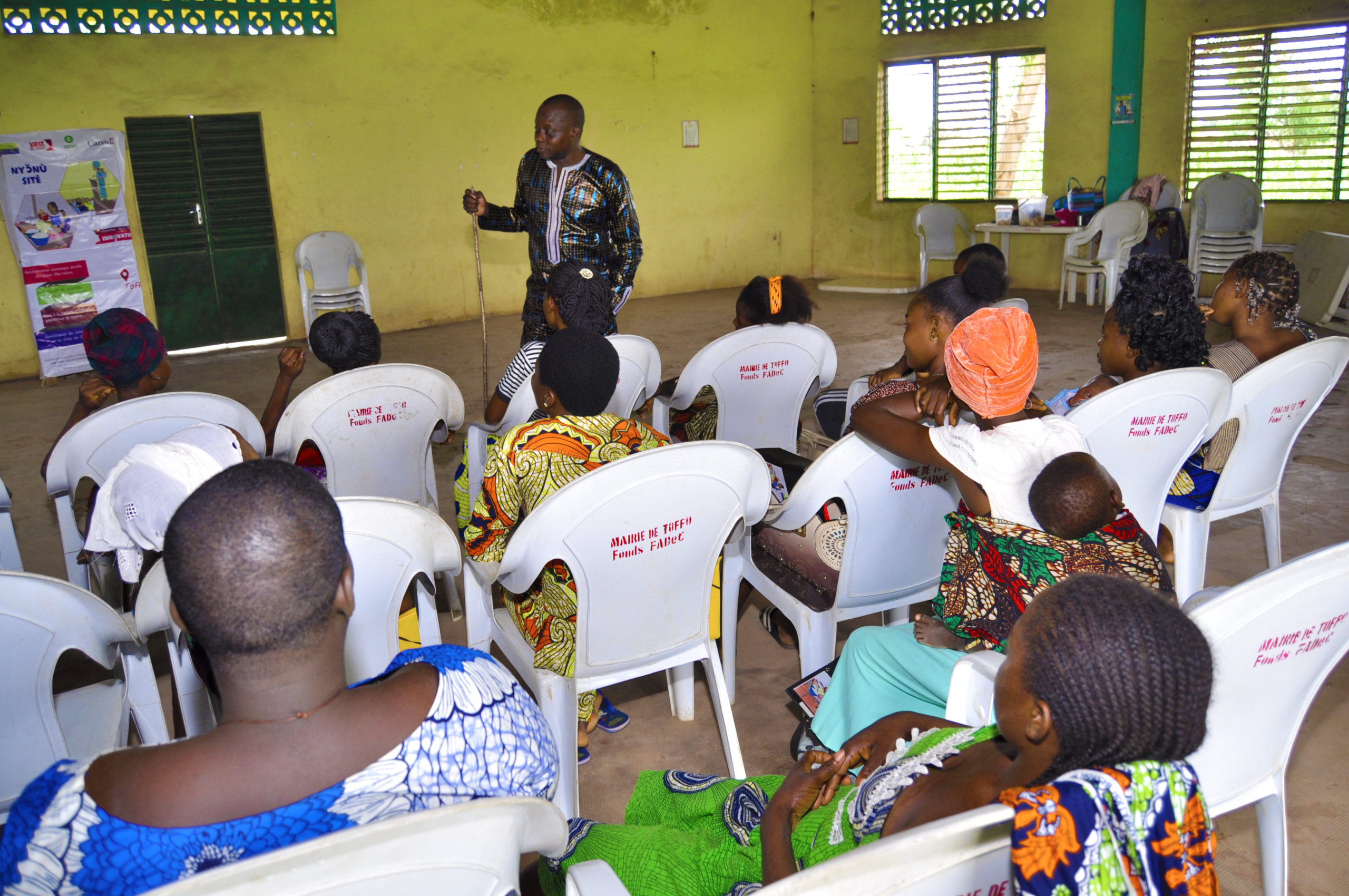 Dans une démarche participative avec la méthodologie d’assemblée de cuisine, le natif du terroir a très tôt mis à l’aise son auditoire de par son fon (langue locale parlée dans la commune) éloquent. A travers slogans, chants, anecdotes, histoires drôles… le haut Conseiller de la République du Bénin a expliqué aux Bénéficiaires, que le mot « Sité » placé dans le titre du projet n’est pas seulement un appel à se mettre debout, mais plutôt une invite à se faire confiance et à se voir en tant que la plus riche femme de la commune qui prend la parole au nom de toutes les femmes de la communauté. Bref, une exhortation à viser le sommet. Ainsi, l’animateur les a amenées à appréhender la nécessité pour une femme d’entreprendre et de travailler dans un espace sécurisé. Ensemble avec les bénéficiaires, le modérateur exposé les pièges à éviter, et surtout, les aptitudes à développer en vue de l’affirmation de leur leadership entrepreneurial et participatif.